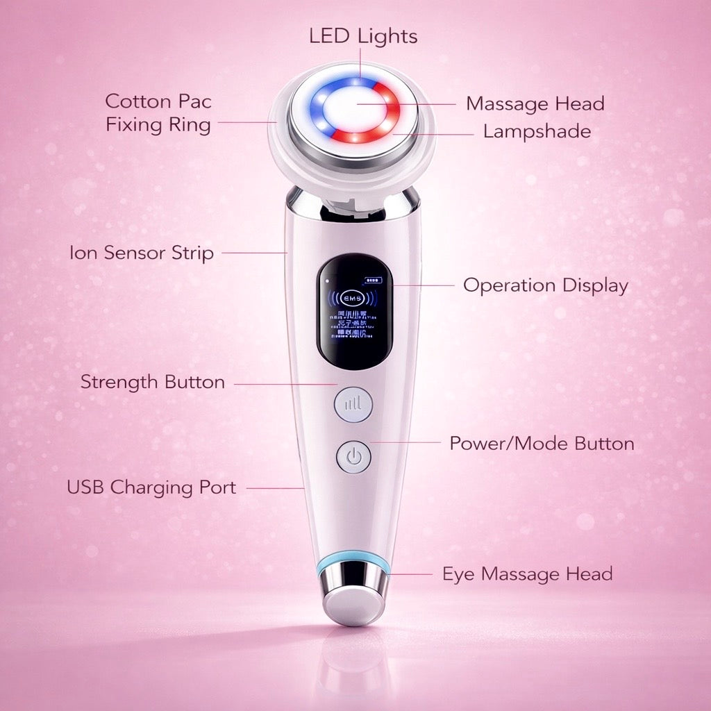 • Interchangeable Heads – Includes a main facial head and a specialized eye massage head.